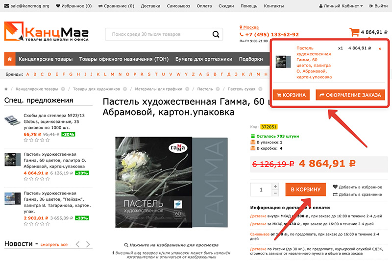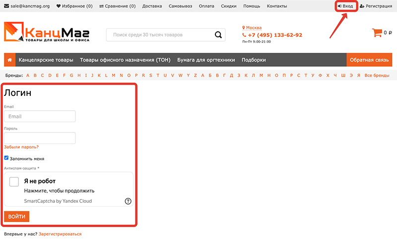 Вы можете купить любой понравившийся товар в интернет-магазине КанцМаг с регистрацией на сайте или без нее. Если раньше Вы заказывали товары на нашем сайте, рекомендуем войти в личный кабинет, введя логин и пароль. Это удобно: система заполнит за Вас известные ей данные автоматически + будет накапливаться скидка. Для этого нажмите в правом верхнем углу кнопку Вход и заполните два поля на новой странице