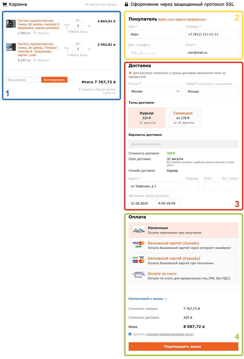 2. Контактные данные получателя, для зарегистрированных пользователей будет учитываться накопительная скидка